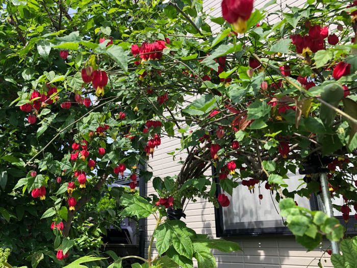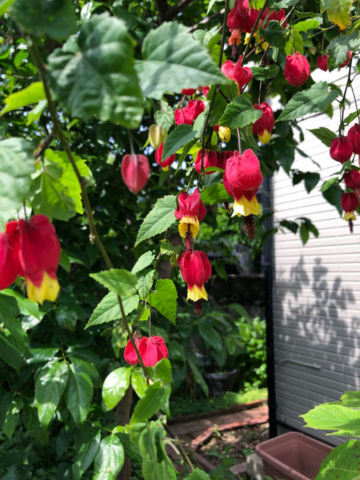 | 形態 | 枝は細く軟弱で、他物によりかかって成長し、枝先は垂れる。葉は長三角形~ハート形で、鋸歯があり、葉柄があり、互生する。6~10月頃、葉腋に長い花柄のある花を吊り下げ、下向きに咲かせる。花弁は淡黄色の5弁花で、赤い5稜がある袋状の萼からやや突き出す形で咲く。花からは褐色の雄しべがついた花柱が突き出る。 |