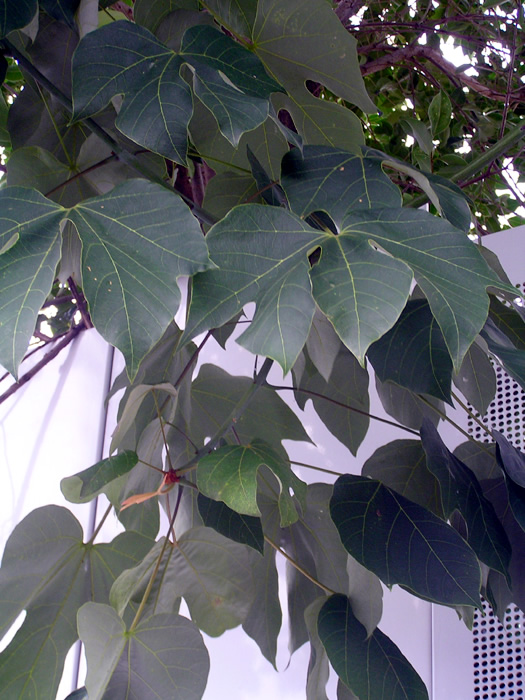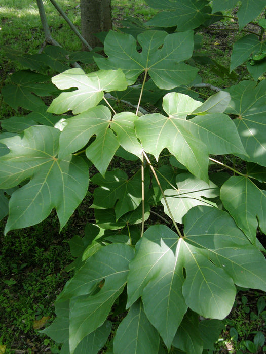 | 形態 | 幹は直立し、樹皮は緑色。葉は掌状に3~5裂し、全縁で、葉柄は長く、互生する。6~7月頃、枝先に大型の円錐花序を何本も作る。1つの花序には雌花と雄花が混在する。花には花弁がなく、黄白色の萼片が5つ、開いて反り返る。雄しべは合着して1本になっている。果実は袋果で、8月の終わり頃には裂開して舟形になり、裂片に緑色で球形び種子が4つつくが、熟すのは10月頃。熟した種子は黄褐色で、シワがある。 |