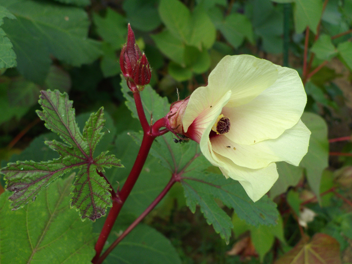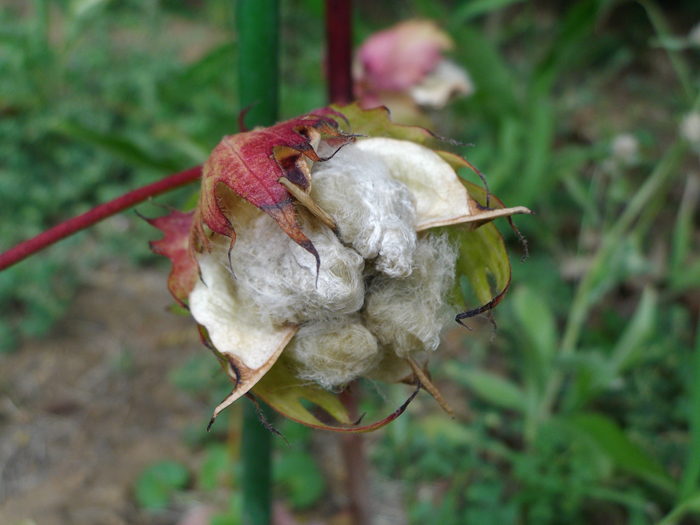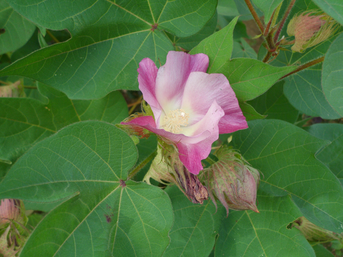 | 形態 | 葉は掌状に3~5裂し、互生する。8~11月頃、茎頂や葉腋に花柄のある5弁花を咲かせる。花弁は黄白色で、らせん状に重なり、受粉後、基部が暗赤紫色になる。果実は蒴果で、成熟乾燥すると3裂し、種子を覆う白い綿毛を露出する。 |
