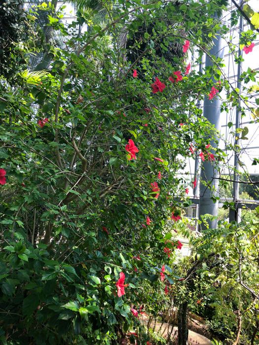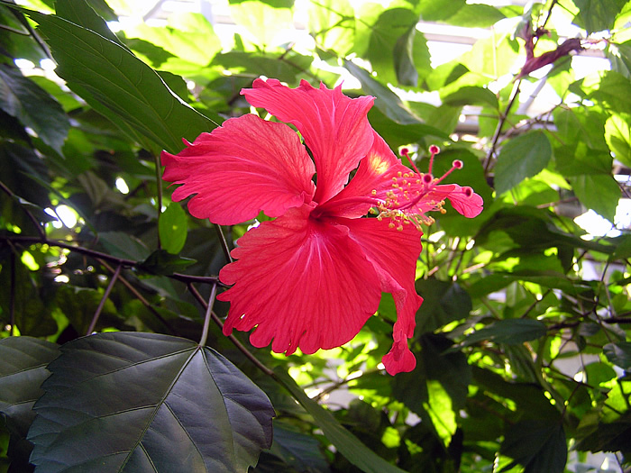 | 形態 | 茎は直立し、よく分枝する。葉は濃緑色で光沢があり、先が尖った卵形~狭卵形で、大きく不揃いな鋸歯があり、葉柄があり、互生する。葉柄のつけ根には針状の托葉がつく。6~11月頃、熱帯~亜熱帯地域では周年、葉腋から赤い5弁花を咲かせる。雌しべと雄しべは途中まで合着して柱状になり、長く突き出す。朝開いて夕方には萎む一日花。5裂の萼の外側を、色のついた苞葉がとりまいているので、萼が2重になっているように見える。 |
