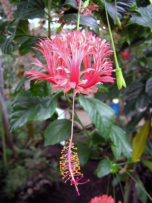 | 名の由来 | 「フウリンブッソウゲ」は、花が下向きに長い柄で垂れ下がる様から。 「Coral Hibiscus」は、花色が珊瑚に似ていることから。 |