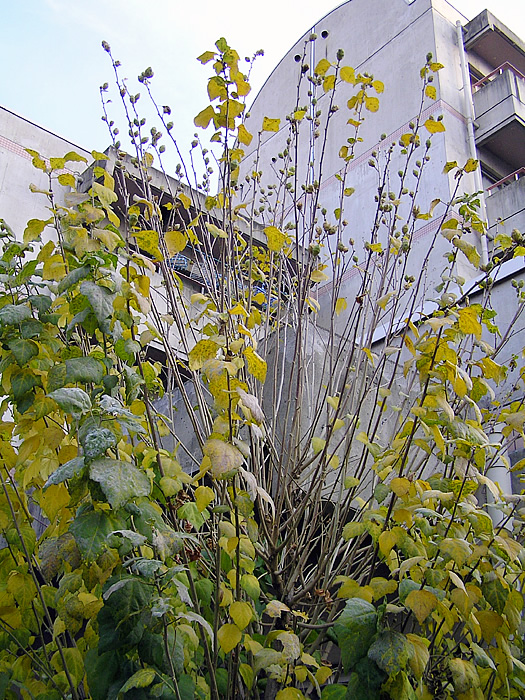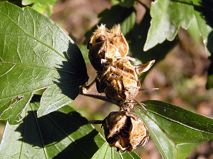 | 形態 | 株立ち樹形で、よく分枝するが縦方向に伸びる。葉は菱形で3浅裂し、鈍い鋸歯があり、葉柄があり、互生する。6~10月頃、新枝の葉腋に5弁花を咲かせる。雌しべと雄しべは途中まで合着して柱状になる。朝開いて夕方には萎む一日花。果実は蒴果で、星状毛があり、5裂する。種子にも長い粗毛が生える。 |