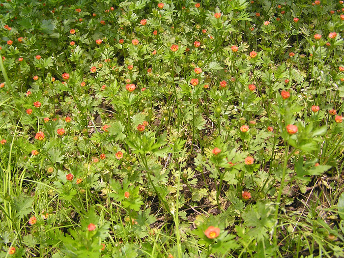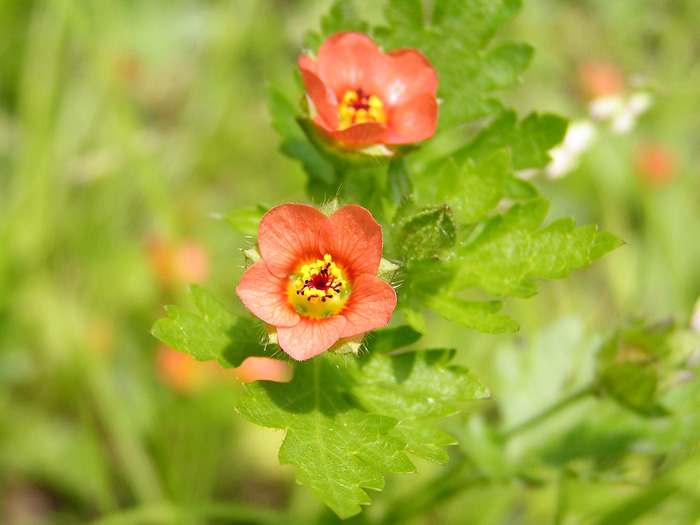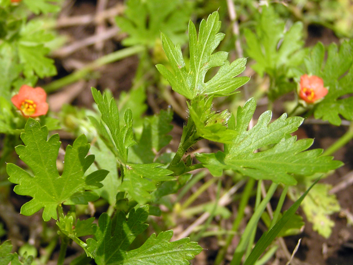 | 形態 | 茎は長く伸びて、節から根を下ろしながら横に広がって成長する。葉は掌状に5~7深裂し、鋸歯があり、葉柄があり、互生する。5~7月頃、葉脇にオレンジ色の5弁花を咲かせる。雄しべの葯は黄色で、雌しべの柱頭が赤い。果実は扁球形の分果で、剛毛があり、黒く熟し、放射状に10~20個に分かれる。 |