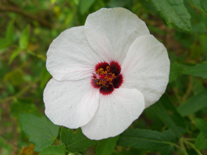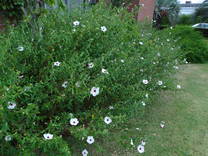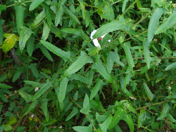 | 形態 | 直立し、細い茎がよく分枝し、こんもりと広がる。葉はやや光沢があり、矛形で、波状の低い鋸歯があり、葉柄があり、互生する。8~10月頃、葉腋から細く長い花柄を出し、5弁花を咲かせる。花は白~淡桃色で、中心部が暗紅色。花弁裏側には赤色の脈が入る。花は一日花。 |