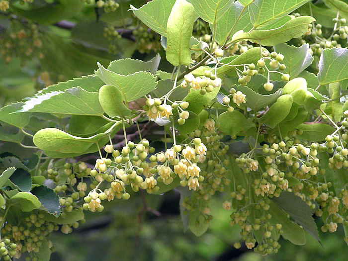 | 類似 | 「シナノキ」とよく似ているが、「シナノキ」の葉裏は葉脈の基部にのみ毛があるのに対して、「ボダイジュ」は葉裏全体に星状毛が密生し灰白色をしている。 花は半開状態で、雄しべが短く、「シナノキ」や「ナツボダイジュ」と比べると地味。 |