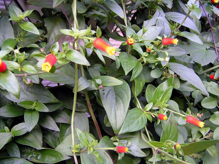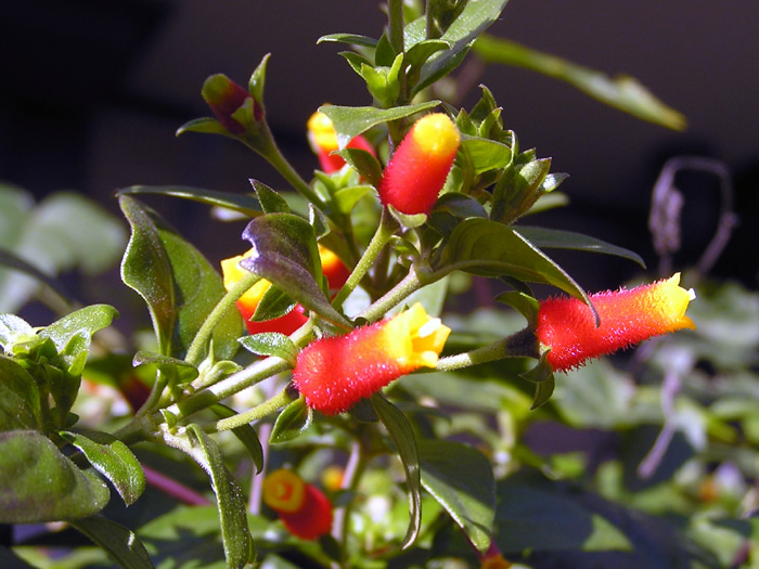 | 形態 | 葉は先の尖った卵形で対生する。10~翌7月に、葉腋に筒状の花をつける。花はやや肉厚で、表面に朱赤の粗い毛が生え、先端は黄色で、4つに裂けて開く。 |