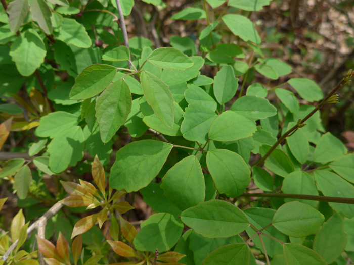 | 形態 | 茎が他物に巻きついて成長する。葉は小葉5枚からなる掌状複葉で、互生する。小葉は卵形で粗い不規則な波状の鋸歯がある。4~5月頃、短枝の先に総状花序を作り、下垂させる。一番基部に雌花1〜3個、枝先に雄花数個〜十数個を咲かせる。花は花弁がなく、紫褐色の萼片3個からなり、雌しべ雄しべは紫褐色。雄花の萼片は色が薄い場合もある。果実は液果で、秋に白~淡紫色に熟し、縦に割れて半透明のゼリー状の果肉に包まれた黒い種子が露出する。 |