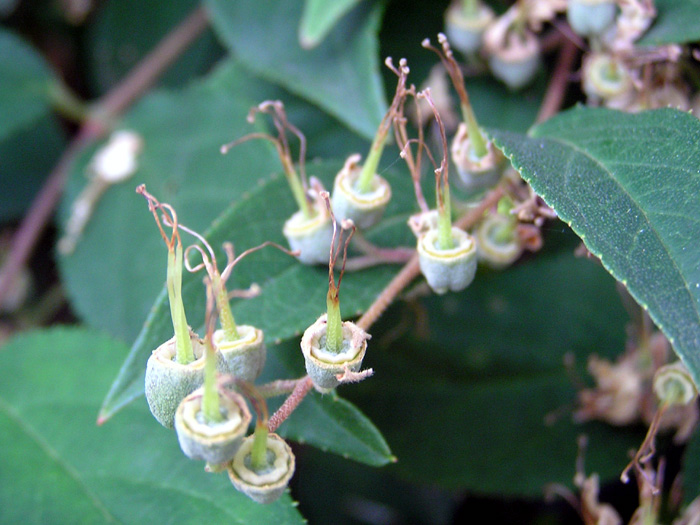 | 形態 | 株立ち状になり、長い枝が大きく垂れる。樹皮は灰褐色で古くなると剥がれる。葉は先が細く尖った長卵形で、2~4mmの葉柄があり、細かい鋸歯があり、対生する。葉の表裏には毛が生え、ざらざらした手触りで、柔らかい。若枝は褐色を帯び、毛が生えている。5~7月頃、枝先に円錐花序を作り、白い5弁花を多数下向きに咲かせる。花柱は3~4本で、花弁と同じ長さ。雄しべは10本で、内5本が長く5本が短い。花糸の両側には狭い翼があり、先端が上に突出す。果実は椀形の蒴果で、花柱が残る。 |