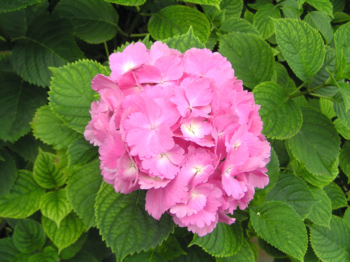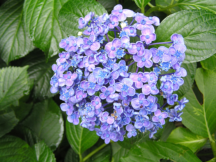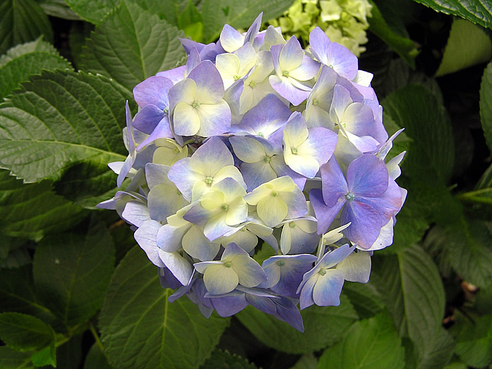 | 形態 | 樹形は株立ちで、よく分枝して半球形になる。葉は緑色で、先が尖った卵形で、鋸歯があり、葉脈ははっきりと浮き出て、対生する。葉は「ホンアジサイ」では光沢があるが、「セイヨウアジサイ」には光沢がない。6~7月頃、1年枝の先端に複集散花序を作る。花弁のように見えるのは萼で、この4枚の萼の中心に小さい花弁と雄しべがある。これを装飾花(飾り花)といい、装飾花だけで手毬型になっているものを普通「アジサイ」と呼ぶ。両性花がないので、結実はしない。 |