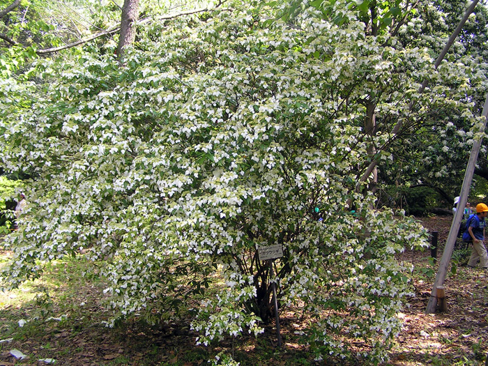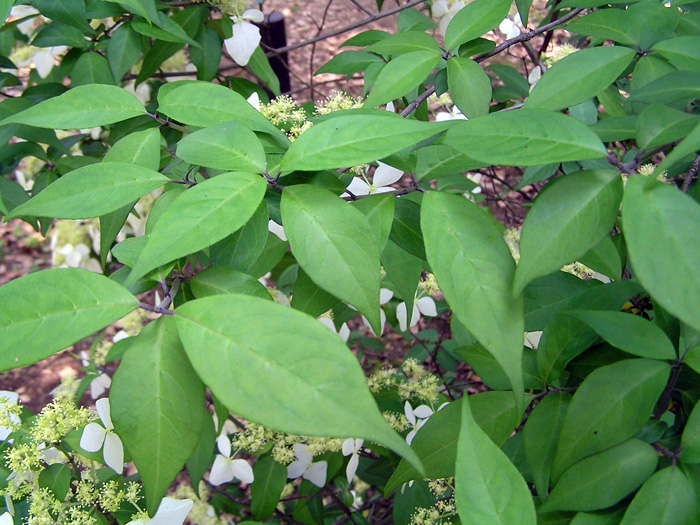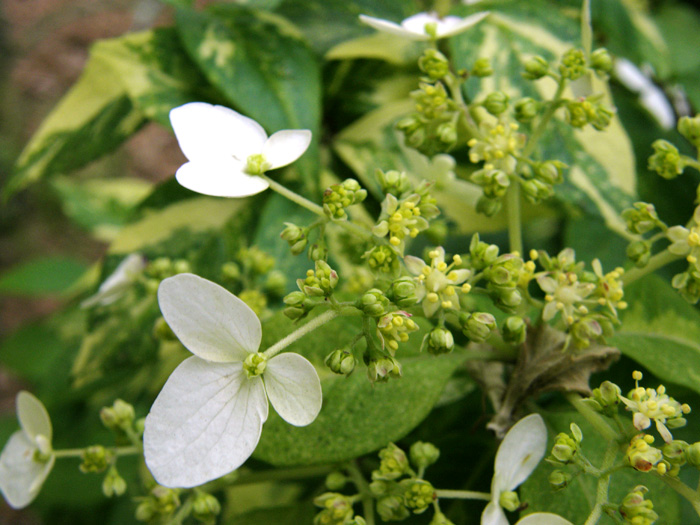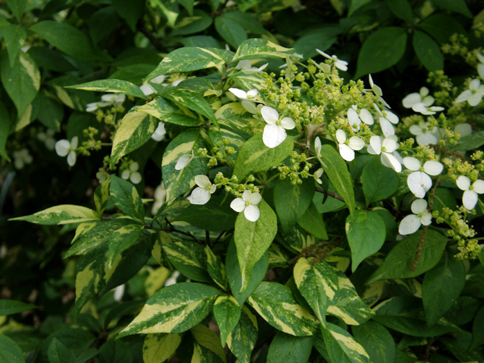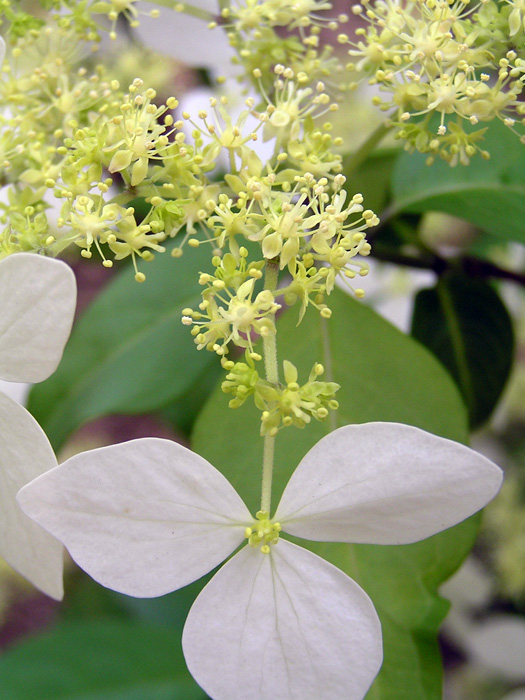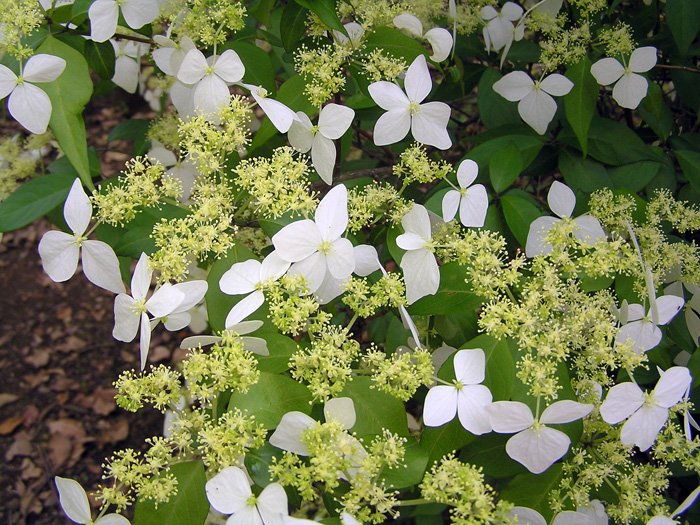 | 形態 | 樹形は株立ちになる。葉は長楕円形で、浅い鋸歯があり、先端は尾状に尖る。やや薄く、光沢があり、対生する。葉裏の脈腋には白い毛が密生する。5~6月に枝先に飾花と、両性花からなる散房花序を出す。装飾花の萼片は3個で白色、ときに黄色味を帯びる。両性花は淡黄緑色。花には強い香りがある。 |