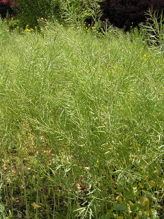 | 形態 | 秋に芽生え、ロゼット状で越冬し、早春に茎を伸ばす。葉は緑色で、縮緬状のしわがある。根生葉は不規則な羽状に深く切れ込み、鋸歯がある。茎生葉は上にいく程小さく、基部は茎を抱き、互生する。3~5月頃、伸ばした茎先に総状花序を作り、鮮黄色の4弁花を咲かせる。果実は長角果で上向きにつく。 |