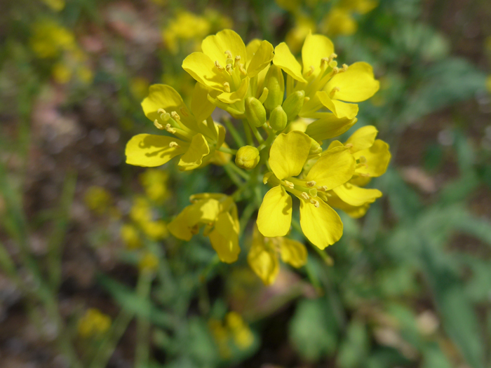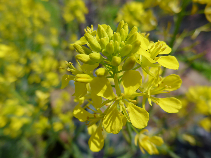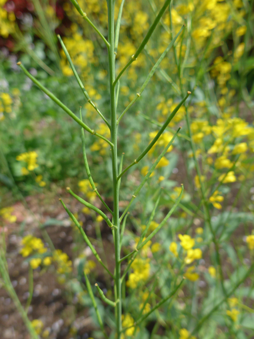 | 形態 | 秋に芽生え、ロゼット状で越冬し、春に茎を伸ばす。根生葉は不規則な羽状に深く切れ込み、鋭い鋸歯があり、花期には枯れてなくなる。茎生葉は上にいく程小さく、葉柄があり、互生する。茎や葉には毛がある。4~5月頃、茎先に総状花序を作り、鮮黄色の4弁花を咲かせる。果実は長角果で上向きにつき、種子は黄褐色~赤褐色の球形で、表面に小さいへこみが密にある。全株に特有の辛味がある。 |