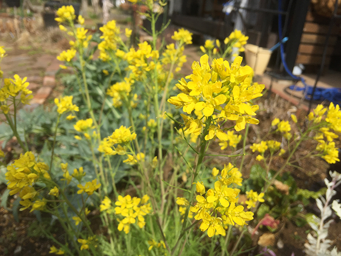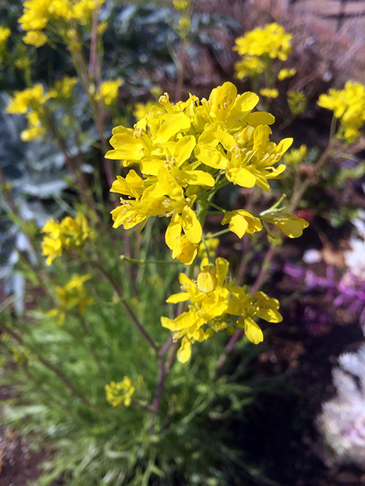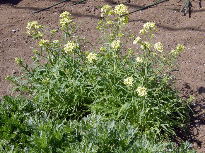 | 形態 | 秋に芽生え、ロゼット状で越冬し、早春に茎を伸ばす。葉は緑色で葉脈は白っぽく、深く鋭い切れ込みがあり、互生する。4月頃、伸ばした茎先に総状花序を作り、黄色の4弁花を咲かせる。 |