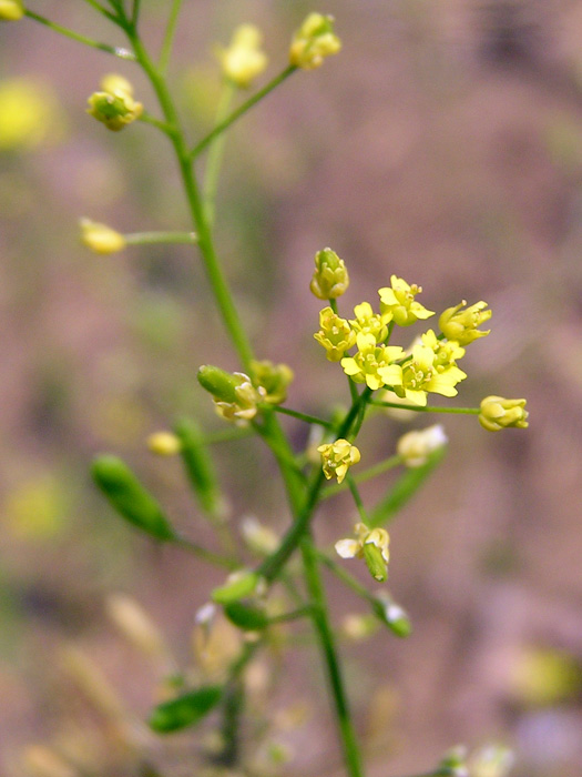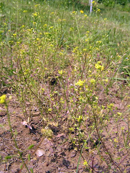 | 形態 | 秋に芽生え、ロゼット状で越冬し、春に花茎を伸ばす。茎や葉には毛が生えている。根生葉はへら形。茎生葉は狭卵形で、粗い鋸歯があり、基部は茎を抱き、互生する。3~6月頃、茎先に総状花序を作り、黄色の4弁花を咲かせる。果実は扁平な長楕円形の蒴果で、長い果柄があり、上の方は斜上、下の方は水平につく。 |