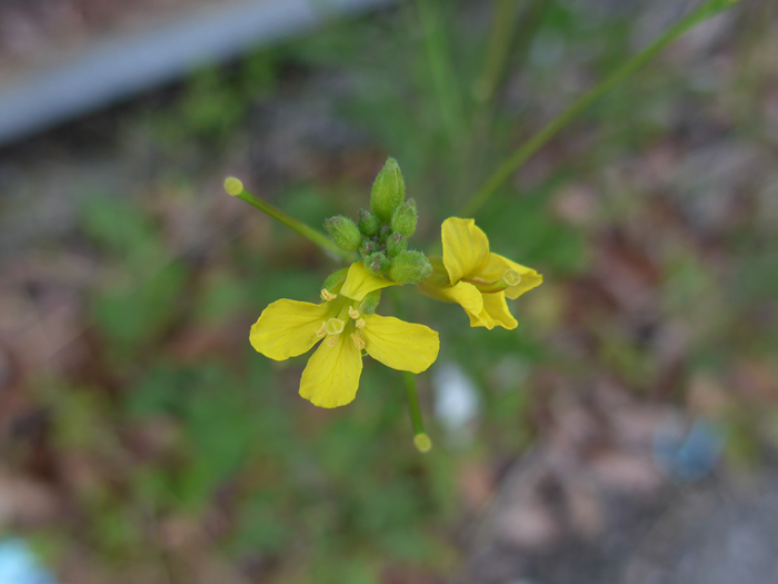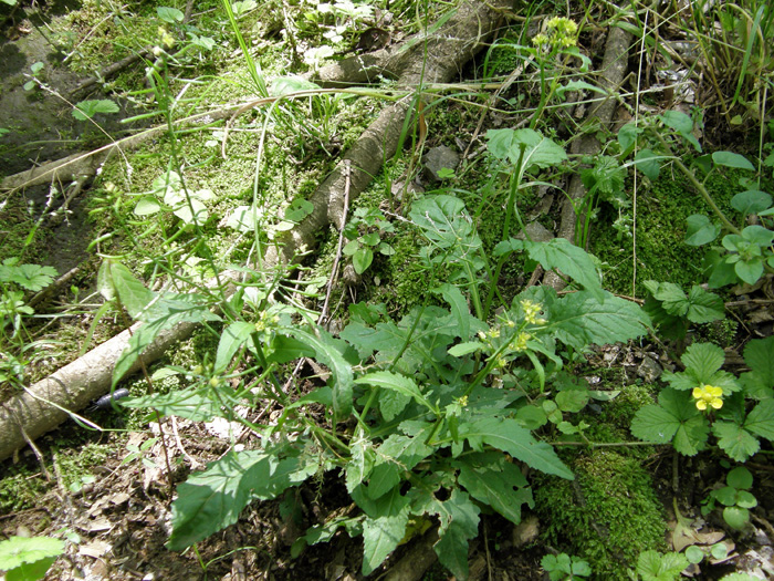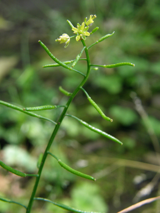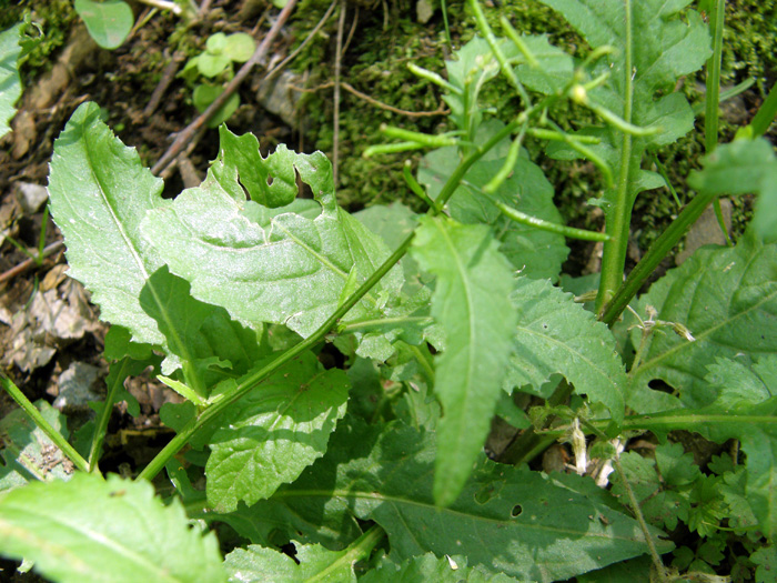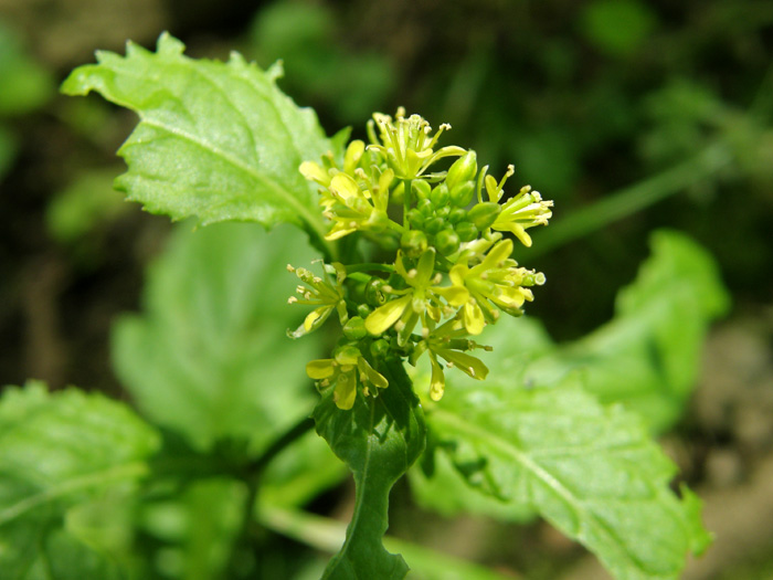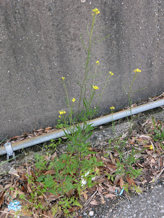 | 形態 | 秋に芽生え、ロゼット状で越冬し、早春に花茎を伸ばす。根生葉は長楕円形で羽状に分裂、または荒い鋸歯がある。茎生葉は披針形で鋸歯があり、互生する。4~9月頃、茎先に総状花序を作り、黄色の4弁花を咲かせる。花茎の下部から順に果実が形成されながら、先端部に次々と花が咲く。果実は長角果で、斜上〜水平につく。中に多数の種子が入る。 |