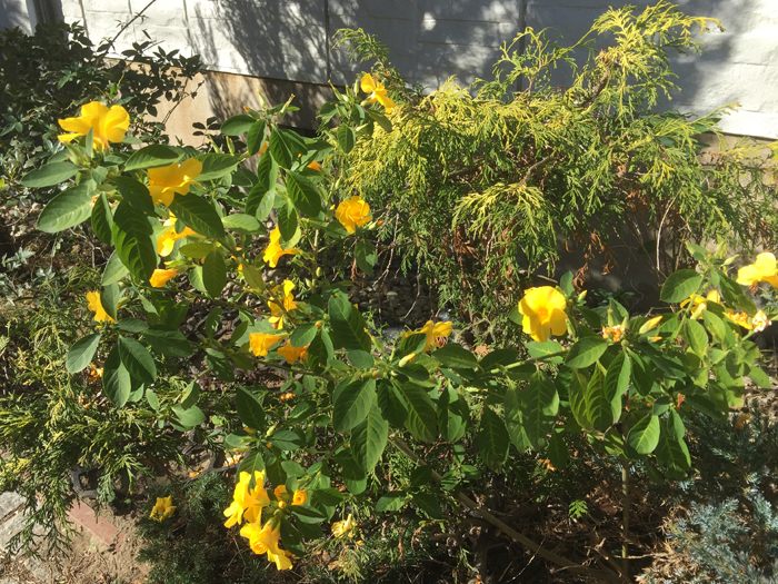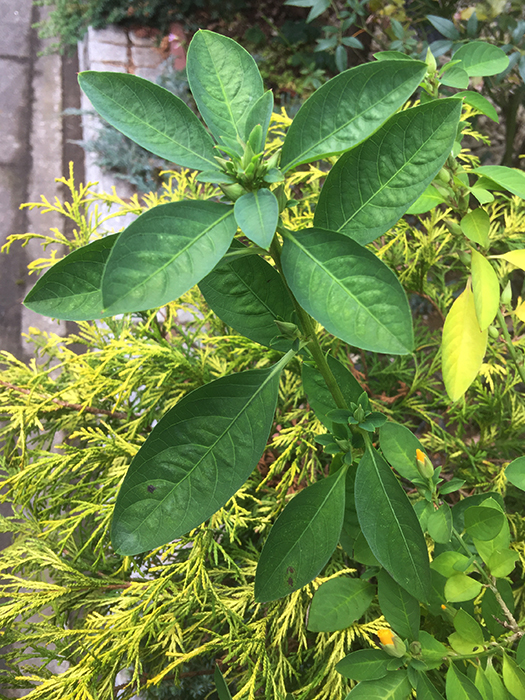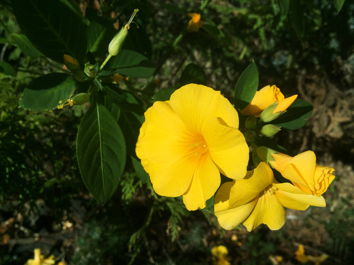 | 形態 | 主幹はなく、株立ち樹形。葉は先がやや尖った楕円形〜倒卵形で、全縁。大きさがまちまちな葉がらせん状に互生する。12~4月頃、枝先の葉腋に単生または束生させて、黄色い漏斗状の5弁花を咲かせる。 |