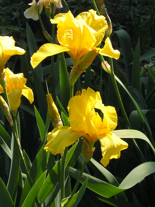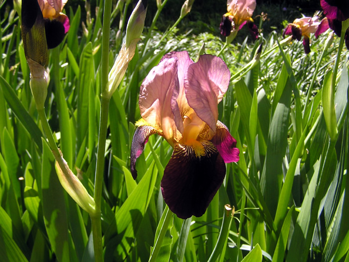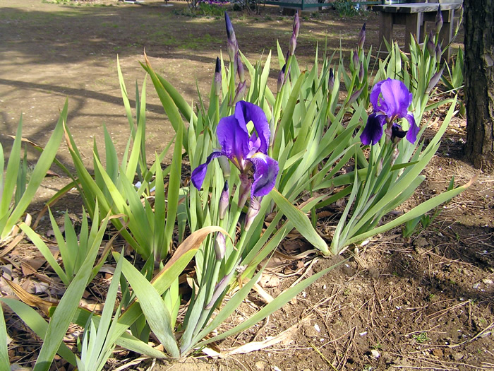 | 品種 | 膨大な園芸品種がある。花色は大変に豊富で、白、黄、ピンク、茶、赤、紫、黒など。 草丈が70~80cm以上の「トール Tall」、40~70cmの「ボーダー Border」、40~70cmで早咲きの「インターミディエイト Intermediate」、30cm前後の「ドワーフ Dwarf」などに区分される。 花色は、上弁と下弁が同じ色の「セルフ」、上弁と下弁が同系色で下弁の色調が濃い「バイトーン」、上弁と下弁が違う色調の「バイカラー」、淡色の花弁に濃色の縁取りが入る覆輪品種の「プリカータ」、一枚の花弁に2色以上が複雑に混じりあった「ブレンド」などがある。 花形は、ヒゲの先端が小さく突起状に変化して伸びた「ホーン」、花弁の端が細かいフリルになる「レース」、花弁が反転するほど強く波打つ「ラッフル」など。 |