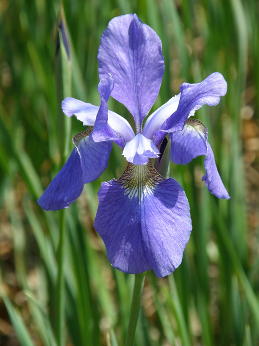 | 形態 | 葉は剣形で、根生し、付け根付近で互生して重なる。5~7月頃、花茎を伸ばして、上向きに紫色の花を咲かせる。外花被片は垂れ下がり、付け根には黄色と紫色のまだら模様が入る。内花被片は直立する。花弁状の雄しべは外側に開いて先端がやや立ち上がり、先端には細かい鋸歯がある。 |