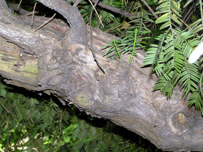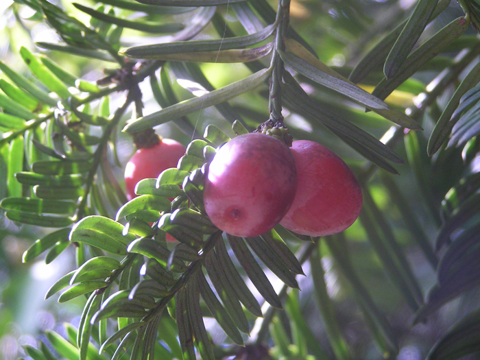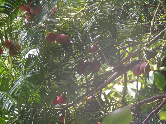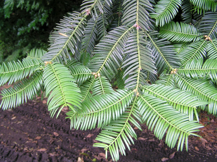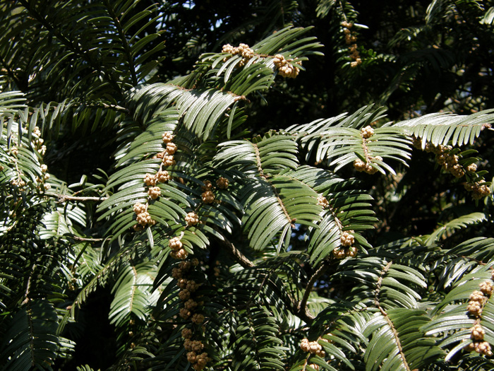 | 形態 | 樹形は中心のない不整形。樹皮は暗褐色で、縦に浅くはがれる。枝は横に広がる。葉は柔らかく、光沢がない緑色の披針形で、葉裏に幅広の2本の気孔線がある。葉は基部は螺旋状につき、鳥の羽状に2列に並ぶ。4~5月頃、花を咲かせる。雄花は薄茶色の卵形で、前年枝の葉腋に下向にひとつずつつき、群生する。雌花は淡緑色で、前年枝の先端に数個つく。種子は楕円形で肉質の外果皮に包まれ、初め粉白緑色で、開花した翌年の秋に赤紫色に熟す。 |