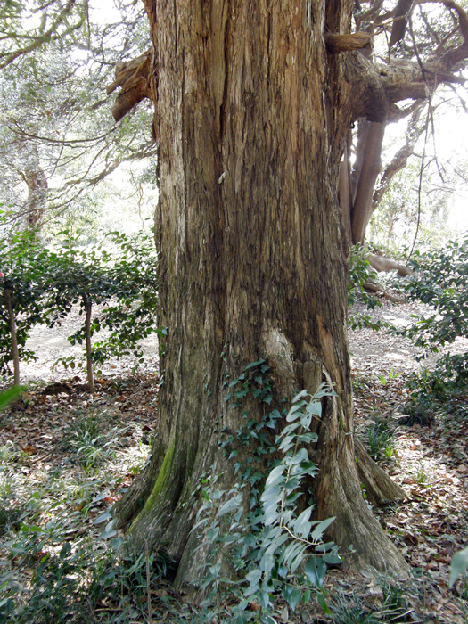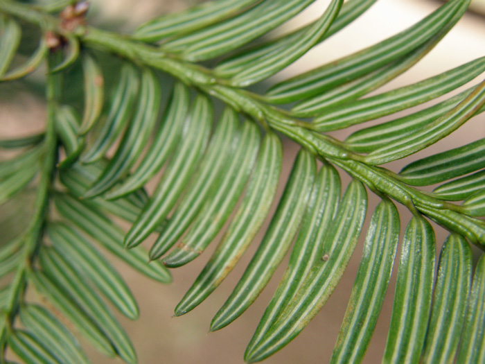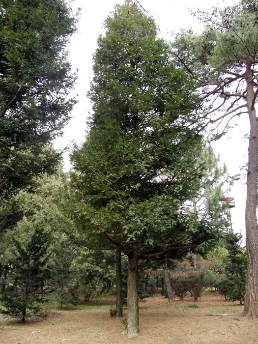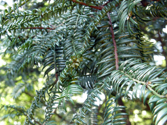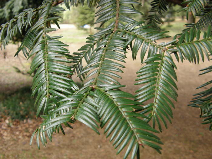 | 形態 | 樹形は幅の広い円錐形で、幹は直立する。樹皮は灰褐色~褐色で、縦に裂ける。枝は対生し、側枝は三叉状に伸びる。葉は硬い革質で、光沢がある濃緑色の、披針形で、葉裏に幅広の2本の気孔線がある。先端は硬く鋭く尖って痛い。葉は基部はらせん状につき、鳥の羽状に2列に並ぶ。4~5月頃、花を咲かせる。雄花は黄色い楕円形で、前年枝の葉腋に下向にひとつずつつき、群生する。雌花は淡緑色で、新枝の先端に固まってつく。種子は緑色の厚い仮種皮に包まれており、開花した翌年の10月頃、紫褐色に熟して裂ける。 |