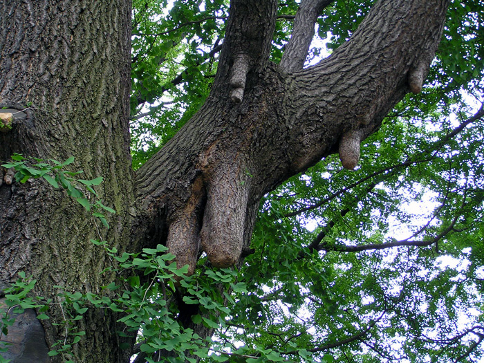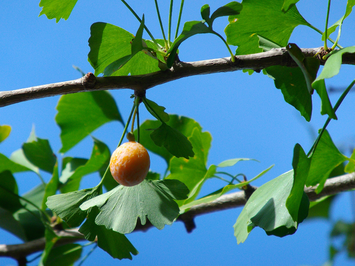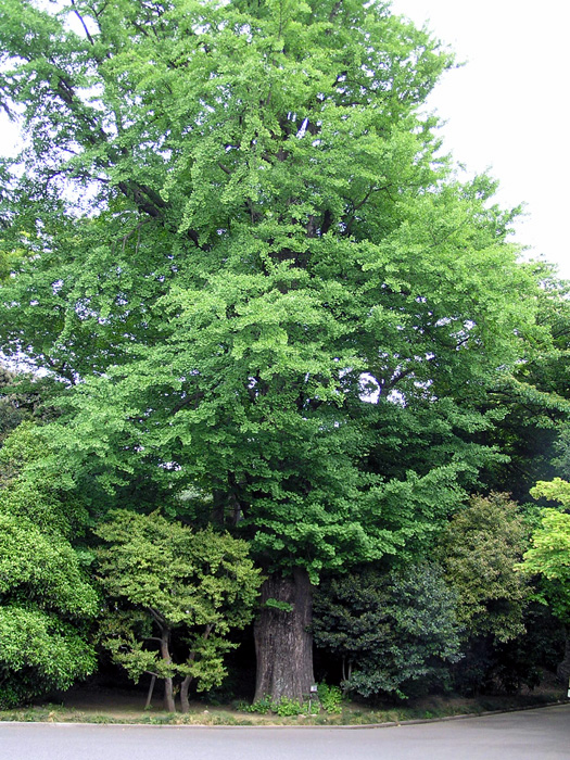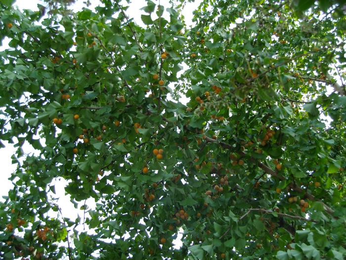 | 形態 | 主幹がまっすぐ立つ。樹皮は荒く、老木になると“乳”と呼ばれる気根が垂れる。長枝からごく短い短枝を出す。葉は中央部が浅く割れた扇形で、長枝では互生し、短枝からは束生する。秋には黄葉して、落葉する。4~5月頃、葉の展開と同時に、短枝に花をつける。雄花は尾状花序になり下垂する。雌花は花柄の先に2個の胚珠をつける。風で運ばれた花粉が雌花につくと、発芽発達し、鞭毛をもって自由に動ける精虫ができ、9月頃受精が行なわれる。果実は核果状で、肉質の外種皮に包まれ、10~11月頃、黄褐色に熟す。外種皮は、悪臭がある。 |