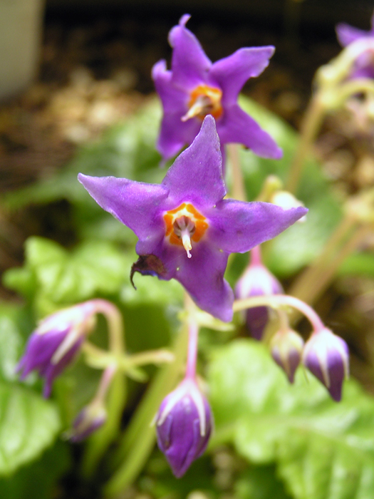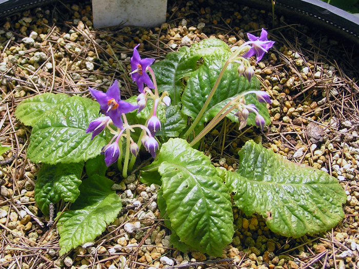 | 形態 | 葉は、楕円状卵形で柔らかく、表面にはちりめん状のしわがあり、粗い鋸歯があり、2~3枚が根生する。葉柄には翼がある。6~8月頃、花柄を伸ばして散形花序を作り、花を10~20個咲かせる。花冠は先が星形に5裂し、紅紫色で奥が白く、橙色の斑が入る。果実は広披針形の蒴果で、微細な種子が多数入る。 |