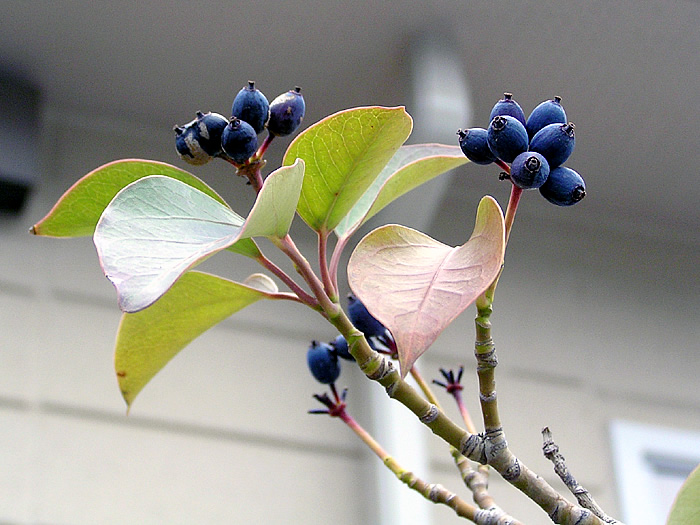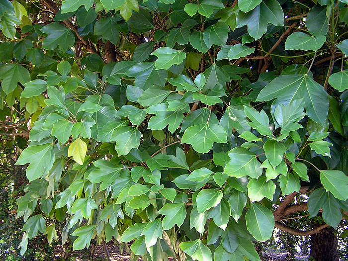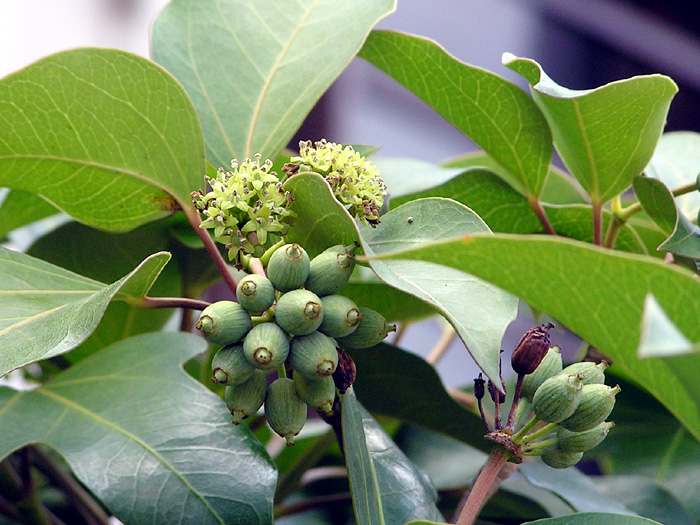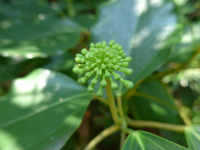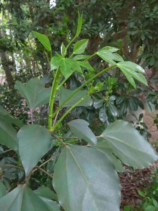| 形態 | 幹は直立、枝分かれする。葉は厚い革質で、互生し、枝先に集中する。葉の形は変異が大きく、若木では3~5裂するが、成木では全縁の楕円形の葉となる。7~8月に、枝先に花枝を伸ばし、淡緑色の花が球状に集まった散形花序を形成する。果実は、液果状で、先端に雌しべの花柱が残り、冬に黒紫色に熟す。 |