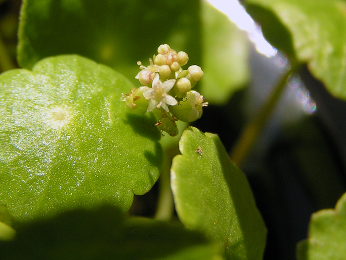 | 形態 | 水中あるいは湿地で、茎は匍匐し、節ごとに発根し、生育する。葉身は円形で、浅い鋸歯があり、葉柄は葉身の中央につき、互生する。6~10月頃、葉腋から短い花柄を出し、上部の節に小さな白緑色の5弁花を数個ずつ固めてつける。果実は扁平な扁円形。 |