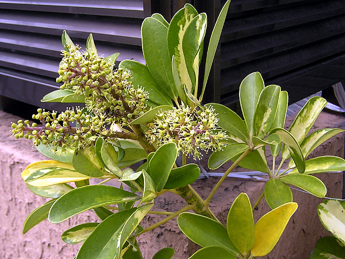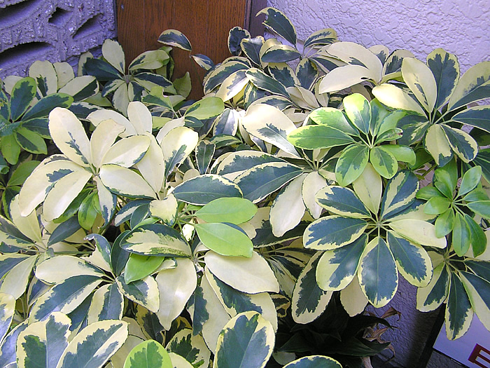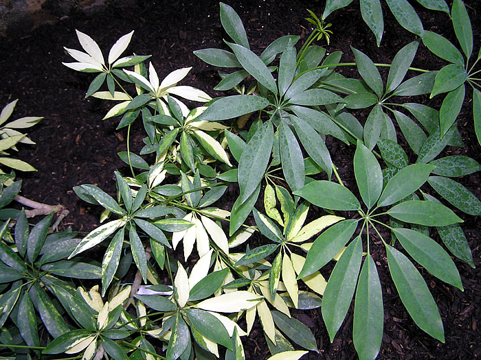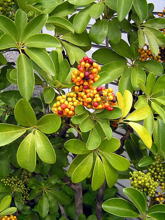 | 形態 | 枝はよく分枝し、大きくなると他物によりかかり登攀して育つ。原種は先の尖った小葉7~11枚からなる掌状複葉で全縁、互生。大株になると地味な花を咲かせ、実がなる。実は最初は黄色で、次第に赤、黒へと変化する。 |