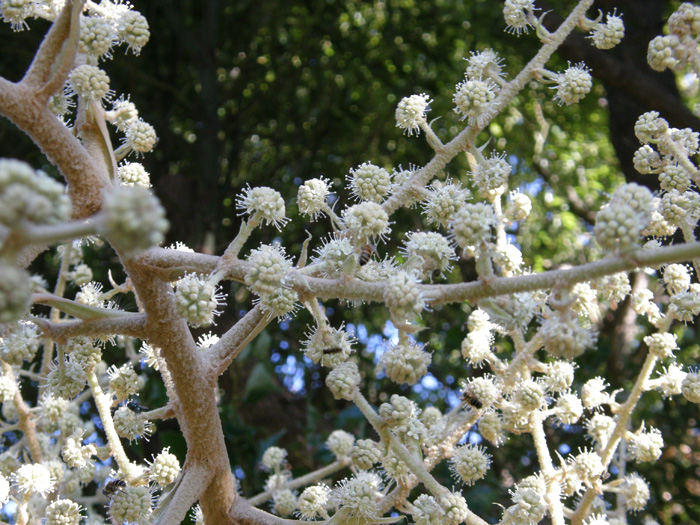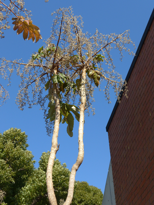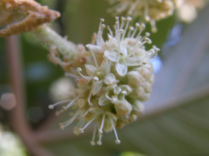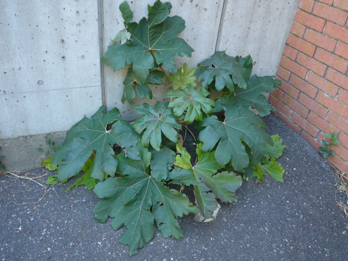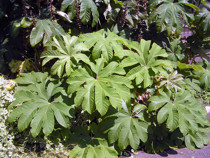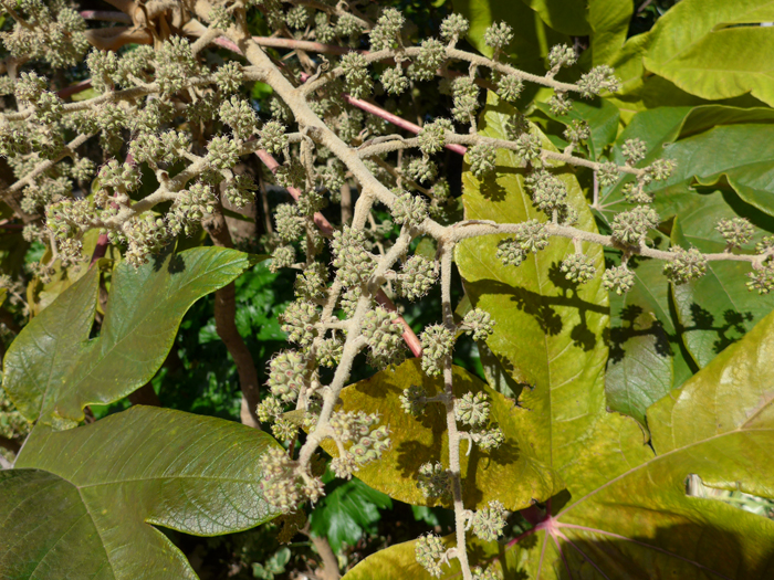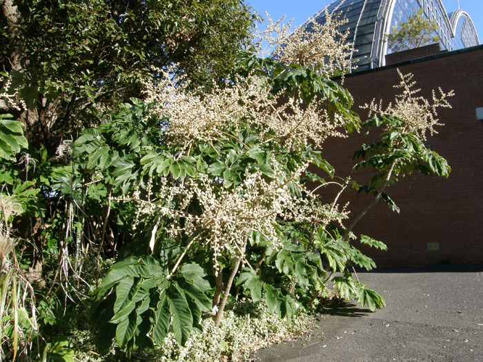 | 形態 | 地下茎で繁殖する。幹はあまり分岐しない。大形の葉は幹の上部に密に互生する。葉は光沢がなく、葉裏に白い綿毛がある。葉は深く5~9裂し、先が浅く2~3裂し、細かい鋸歯がある。11~12月に枝先に、黄緑白色の小さな花が集まった球状の散形花序をつけ、さらにそれらが円錐状に集まって複合花序を作る。花弁は4枚、雄しべは4個、雌しべは2個。果実は液果で、先端に雌しべの花柱が残り、2~3月頃暗赤紫色に熟す。 |