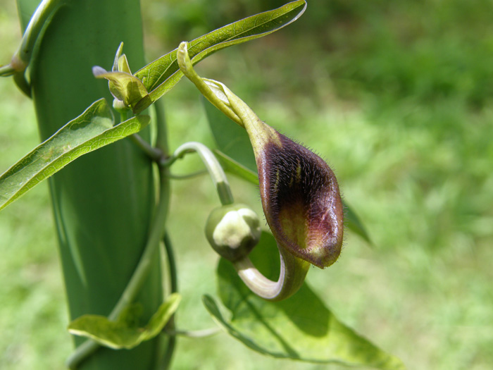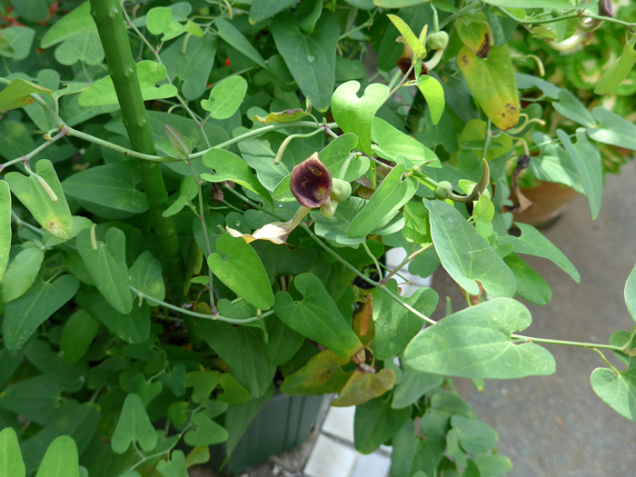 | 形態 | 茎を他物に巻きつけながら成長する。葉は、基部は心形で葉先がやや丸い三角状卵形で、互生する。緑色で全縁で無毛、質は薄い。7~9月頃、葉脇から長い花柄があるラッパ状の花を咲かせる。筒先は平らに口を開け、一端が尖って長く伸び、よじれる。筒の部分は細く曲がり、基部は球形に膨らみ、雄しべ雌しべはこの部分にある。花の外側は薄緑色で、内側は海老茶色で奥を向いて毛が密生する。花弁はなく、ラッパ状の部分は萼。雌性先熟で、匂いで小型のハエをおびき寄せ、奥向きに密生する毛によって花の奥に閉じ込める。その後、雄しべが花粉を出すと、毛は脱落し、花粉をつけたハエが花から脱け出して、他の花の中に入り、受粉させる。果実はほぼ球形の蒴果で、熟すと、基部から6裂し、果柄も糸状に6裂してぶらさがる。 |
