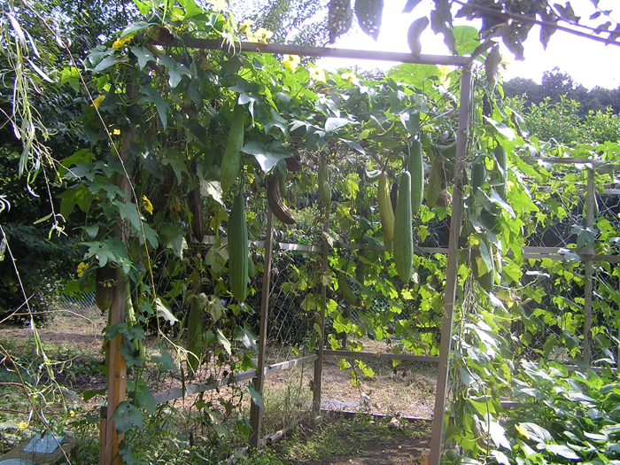 | 利用 | 庭植え、鉢植え、フェンス。若い果実は食用になる。茎を切ると出てくる液は、ヘチマ水として化粧水や薬用として使われる。果実は、さらして繊維だけにして、タワシにする。 |