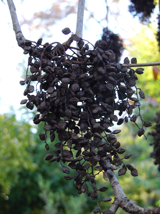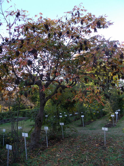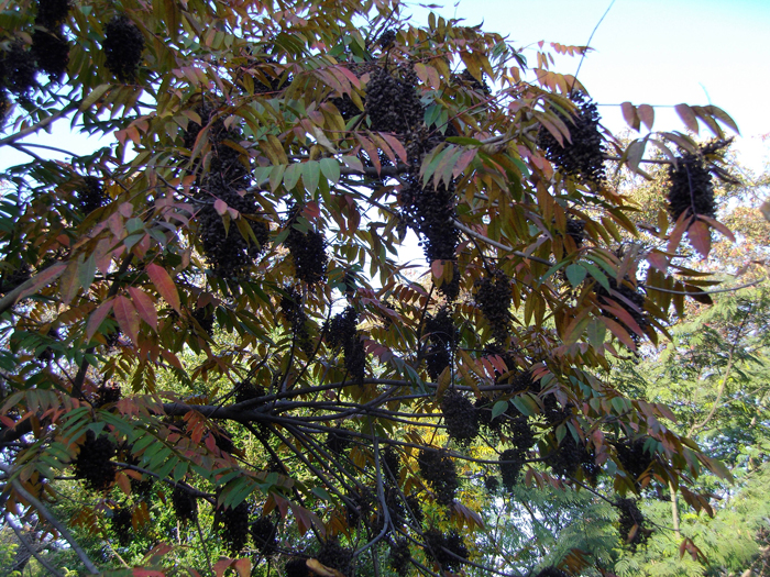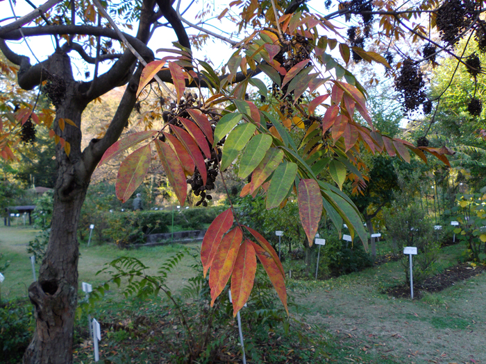 | 形態 | 樹皮は滑らかな灰褐色で、小さな皮目が多い。葉は、小葉9〜15枚からなる奇数羽状複葉で、互生する。小葉は長卵形〜長楕円形で、先が尖る。両面ともに短毛が生え、全縁。秋に紅葉する。5〜6月頃、枝先の葉腋から円錐花序を出し、5弁花を多数咲かせる。花弁は薄黄緑色で、反り返る。果実は扁球形の核果で、9〜10月頃、光沢がある淡褐色に熟す。その後、外果皮が剥がれて、縦筋があり白い蝋質の中果皮が露出、それも剥がれると飴色の核が残る。 |
