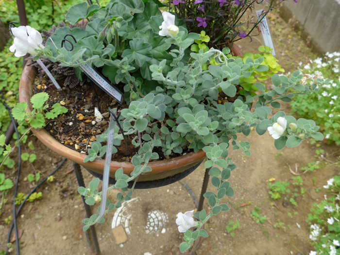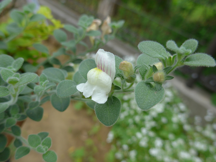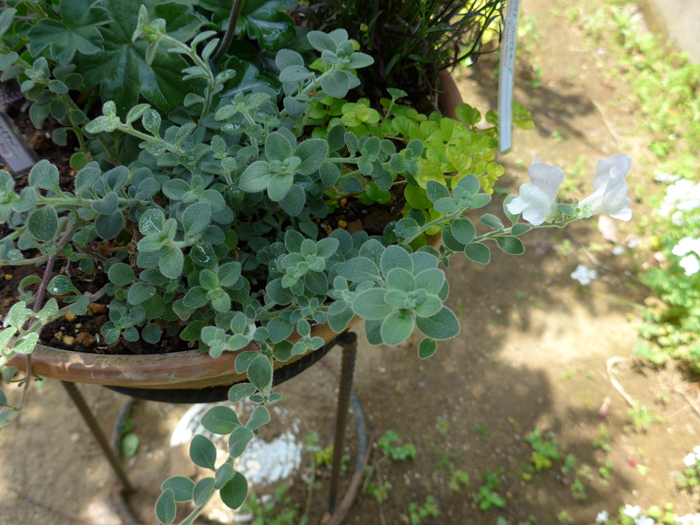 | 形態 | 茎は軟弱で、株元からよく分枝し、マット状に匍匐、下垂する。葉は卵形~楕円形で、全縁で、下部は対生し、上部は互生する。葉は毛に覆われ、灰緑色。4~11月頃、茎頂に総状花序を作り、淡黄色の唇形花を咲かせる。 |