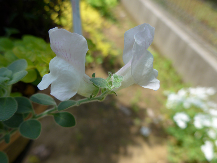 | 特徴 | 花色は白で、上唇は2裂、下唇は3裂し、上唇には薄紫色の筋が入る。 |