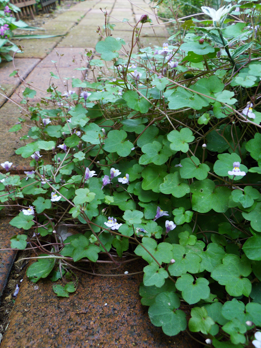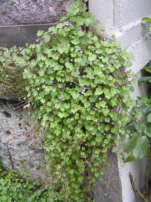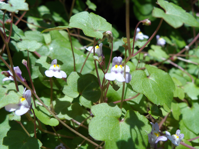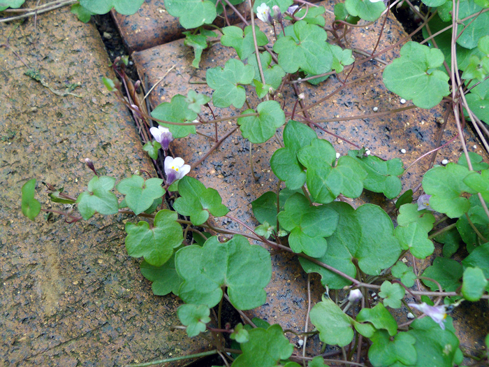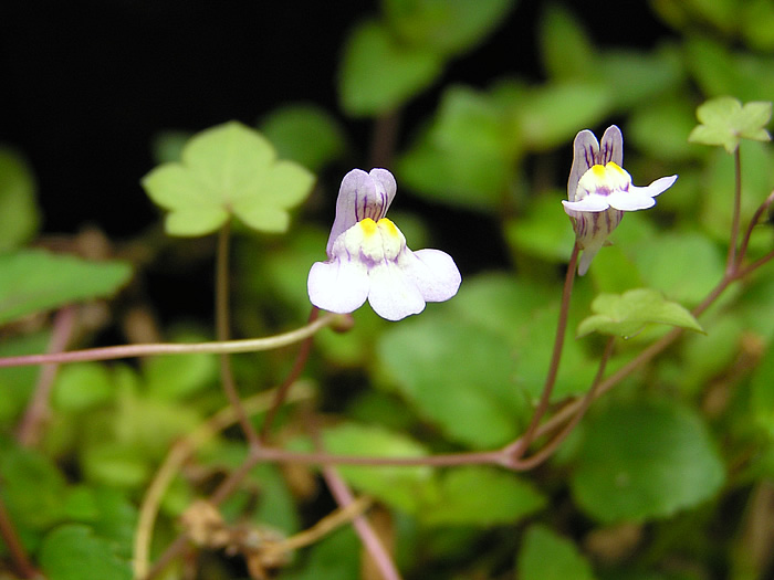 | 形態 | 茎は赤味を帯び、軟弱で、匍匐、下垂し、節からは根を出して広がる。葉は5~7浅裂の掌形で、長めの柄があり、互生する。4~11月頃、葉腋から長い柄を立ち上げ、唇形花を咲かせる。花は淡赤紫色で、下唇に白っぽく中央が黄色い突起部があり、上唇は2裂、下唇は3裂する。花の後ろには距が突き出る。 |