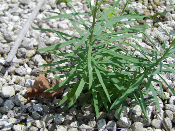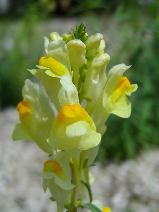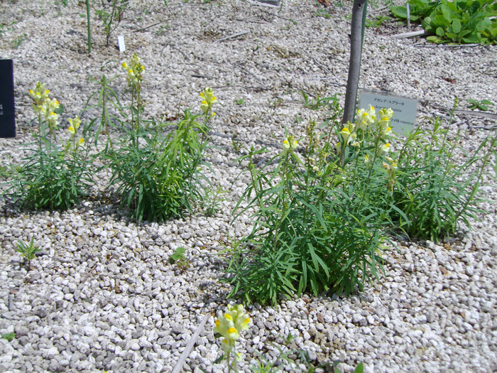 | 形態 | 基部からよく分枝し、直立する。茎や葉は粉白色を帯びた緑色。葉は線形で、無柄で、互生する。6〜8月頃、茎先に総状花序を作り、下から順に花を斜め上向きに咲かせる。花は黄色の唇形花で、上唇は2裂、下唇は3裂し、下唇には濃黄橙色の隆起部分がある。花の後ろ側には先端が尖った筒状の距が突き出て、真下を向く。果実は球形の蒴果。 |