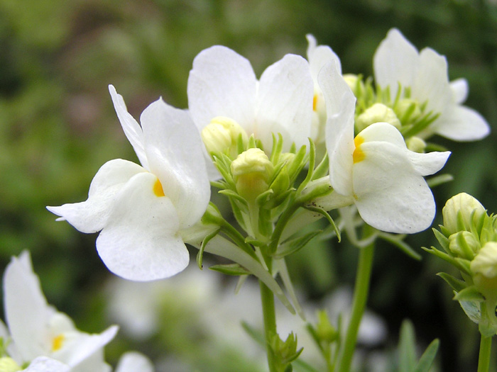| 形態 | 基部からよく分枝し、直立する。茎葉は明るい薄黄緑色。葉は線状披針形で、無柄で、下部では輪生、上部では互生する。5~6月頃、茎先に総状花序を作り、下から順に唇形花を咲かせる。花の後ろ側には先端が尖った筒状の距が突き出る。果実は球形の蒴果。 |