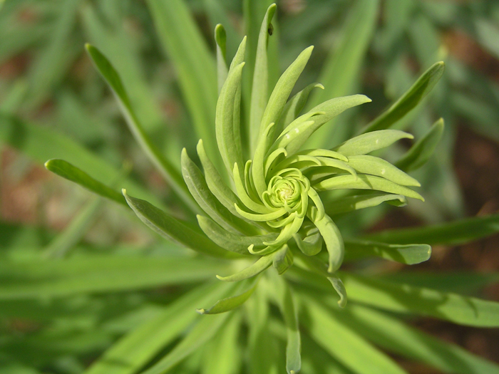 | 形態 | 基部からよく分枝し、直立する。茎や葉は粉白色を帯びた緑色。葉は線形で、無柄で、互生する。6〜8月頃、茎先に総状花序を作り、下から順に花を咲かせる。花は紫色の唇形花で、上唇は2裂、下唇は3裂し、下唇には隆起部分がある。花の後ろ側には先端が尖った筒状の距が突き出る。果実は球形の蒴果。冬季、茎葉は枯れるが、株元に新芽が出て越冬する。 |