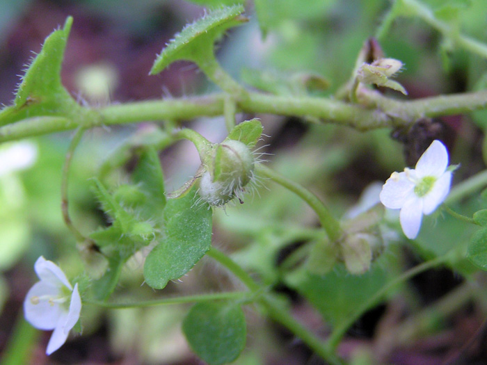 | 形態 | 株元から分枝し、地面を這うように広がる。全体に長い毛が多く生える。葉は2~5対の大きな鋸歯があり、茎の下部では対生、上部では互生する。2~4月に基部が薄黄色を帯びる純白の目立たない花をつける。果実は蒴果で2個の玉をつけたような形で毛が多い。 |