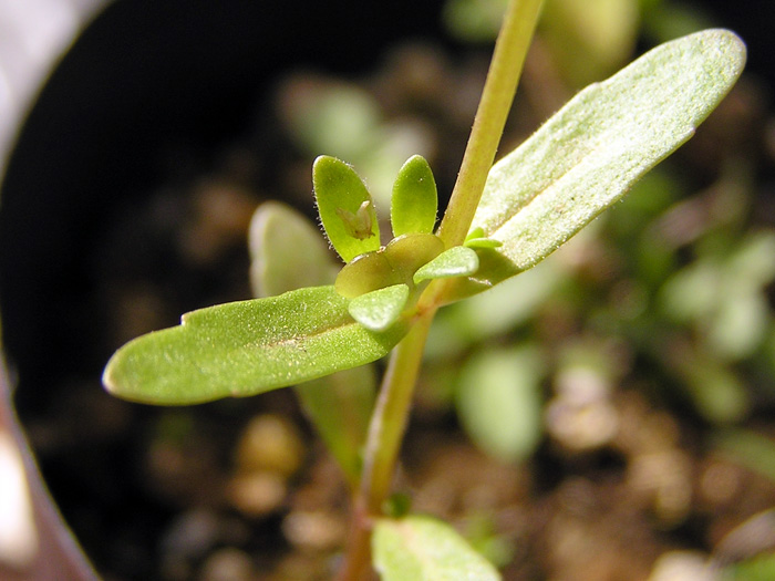| 形態 | 茎は下の方で枝分かれし、直立する。葉は下の方では対生、上部では互生する。形は狭披針形~広線形で、下の葉には粗めの鋸歯があり、上部ではほとんどないか全縁になる。4~5月頃、葉脇に小さな白い花をひとつづつつける。雄しべは2個、雌しべは1個。萼片は4個で、花よりも大きく、果実の時期にも残る。果実は、平たいハート形。果実にはしばしば「ムシクサツボミタマフシ」という昆虫が産卵して虫えいができ、球状にふくれる。 |