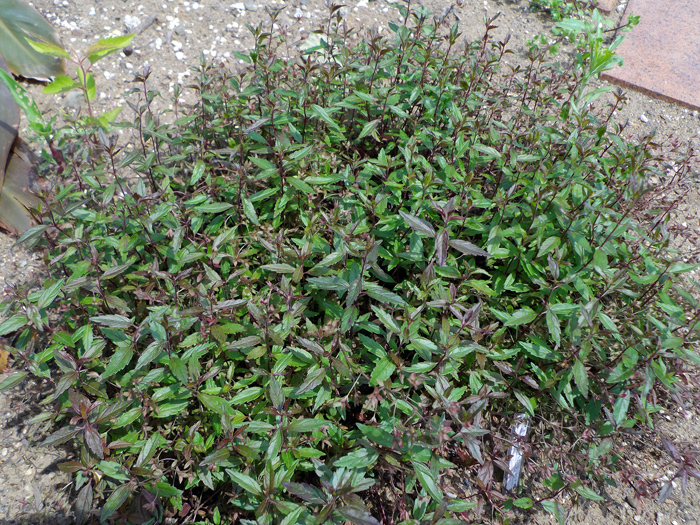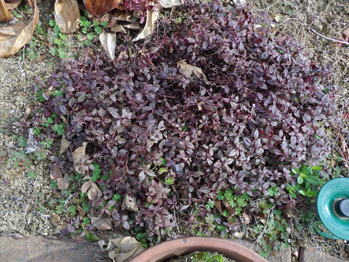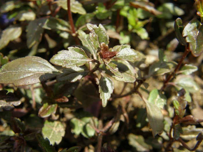 | 形態 | 地面を匍匐して広がる。葉は光沢のある披針形で、不規則な鋸歯があり、対生する。冬季、寒さにあたると葉色がブロンズ色になる。3~5月に、明るい群青色の花をたくさんつける。 |