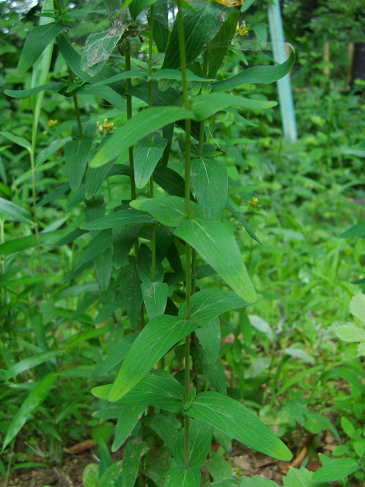 | 形態 | 茎は直立し、ほとんど分枝しない。葉は先が丸みを帯びた広披針形で、全縁で、葉柄は無く、対生する。葉には細かく黒い油点が散在する。6~9月頃、茎頂に円錐花序を作り、黄色い花を咲かせる。花は暗くなると閉じる。花弁と萼片には黒線状の油点がある。果実は卵形の蒴果。 |