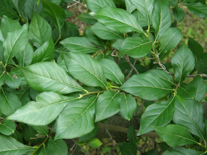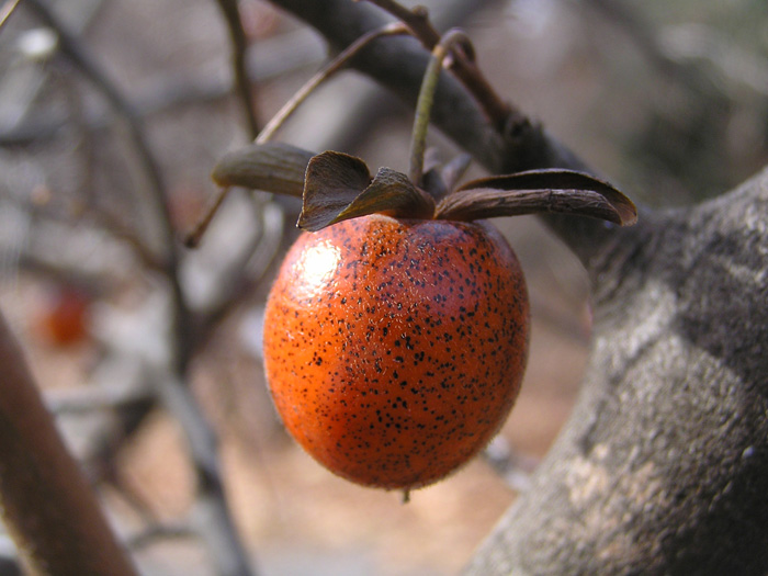 | 形態 | 葉は丸味を帯びた菱形で、3~4月頃に花をつける。果実は先端が細く尖った楕円形の液果で、橙色に熟す。 |