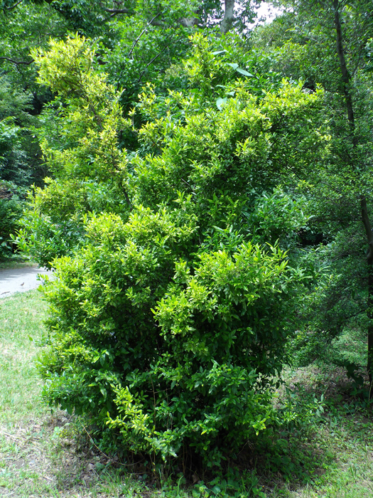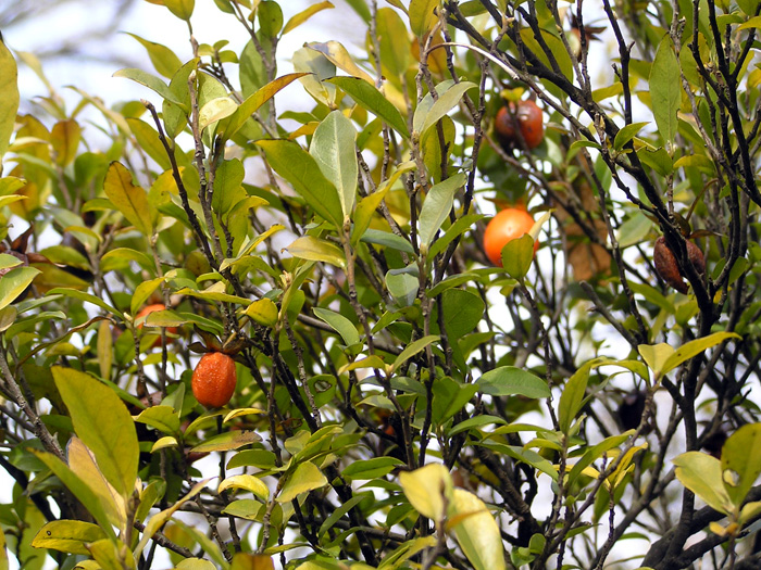 | 形態 | 枝葉は密生し、棘がある。葉は艶があり、細長い楕円形で、全縁で、互生する。開花時期は5~6月頃。果実は球形~楕円形の液果で、長い柄がつき、10月頃橙色に熟す。 |
