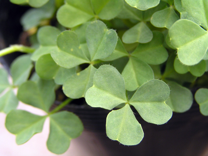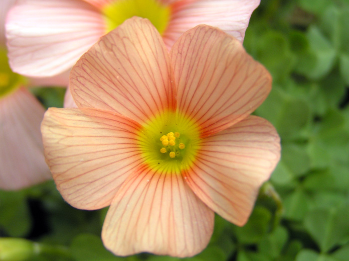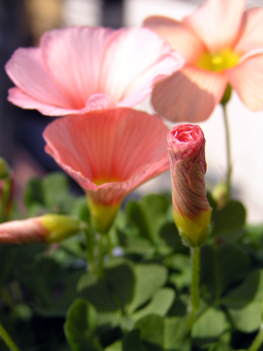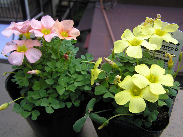 | 形態 | 葉は地際から叢生し、三出複葉で、小葉は切れ込みの浅い倒心型。1~4月頃、花茎を出し、5弁花を咲かせる。花はパステルカラーのピンク、オレンジ、黄色などで、放射状に濃色の筋が入り、中心部は黄色。真夏に地上部が枯れるが、秋にはまた新芽が出る。 |