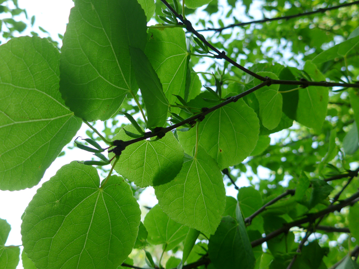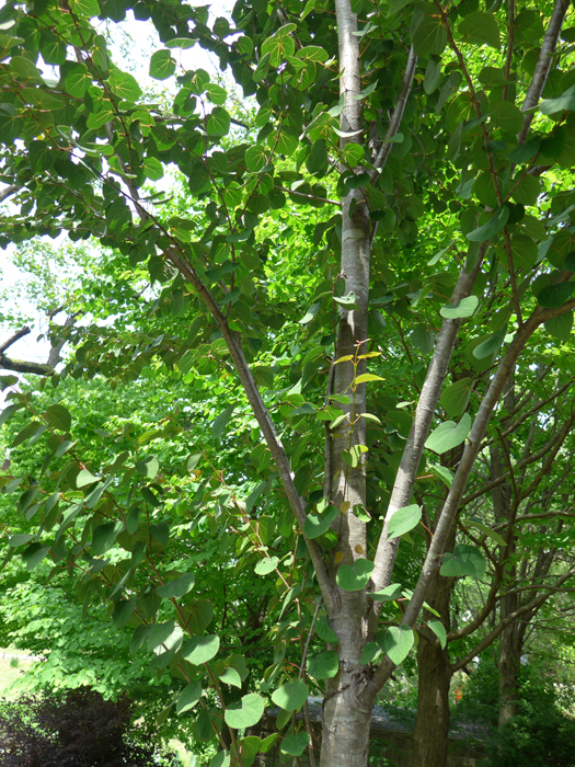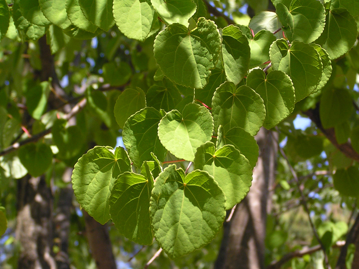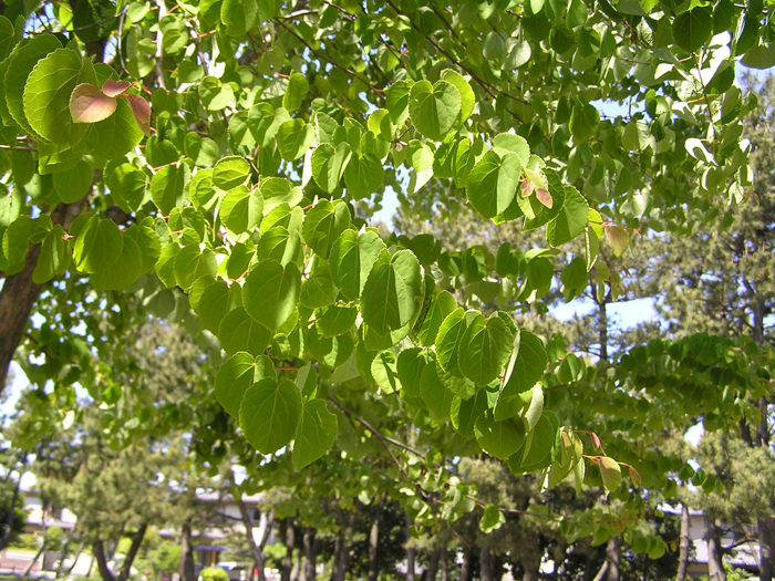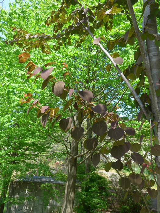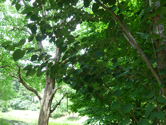| 形態 | 幹は直立し、多くの枝が箒状に斜上し、円錐形の樹冠を作る。株元からひこばえを出して、株立ちになることも多い。幹は暗褐色で、縦に裂け目ができて樹皮が剥がれ落ちる。短枝と長枝があり、長枝には葉が対生し、短枝には1つつく。葉は、円形に近い心形で、鈍い波状の鋸歯がある。4月頃、葉の展開に先立って花を咲かせる。花は花弁も萼もなく、基部は苞に包まれる。雌花は3~5個の雌しべからなり、柱頭は糸状で淡紅色。雄花は、多数の雄しべからなり、葯は淡紅色。果実は豆の莢に似た袋果で、10月頃に熟すと、2裂して先端に薄い翼のついた種子を出す。葉は、秋には黄葉して落葉する。落葉した葉は、独特の甘い香りを出す。 |