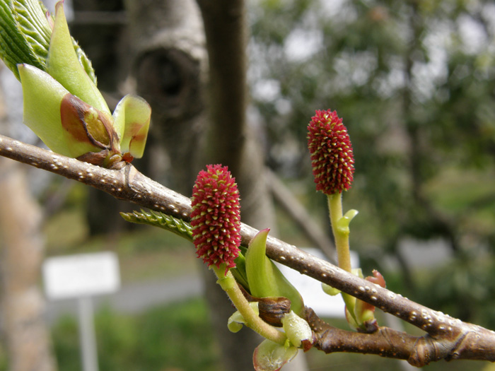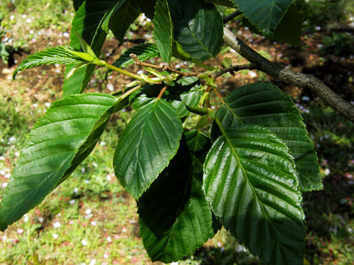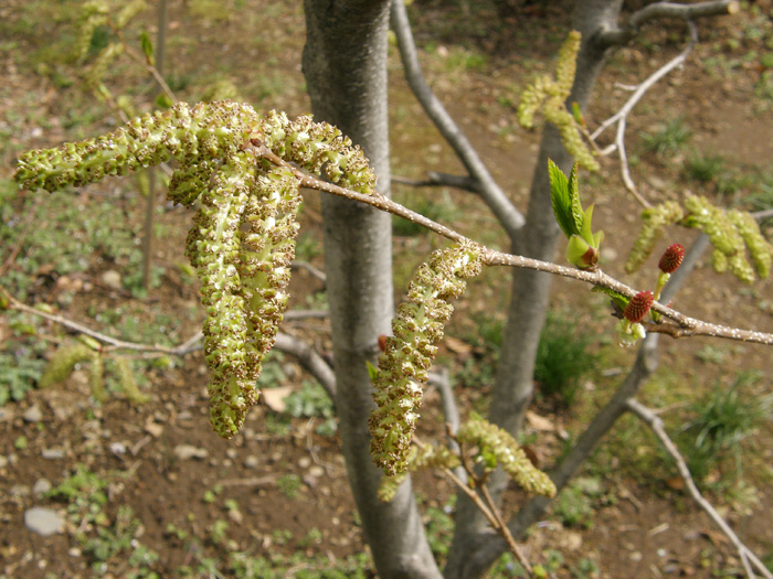 | 形態 | 樹皮は灰褐色で皮目が多く、縦に筋が入る。葉は先の尖った卵形で、側脈が目立ち、鋭い重鋸歯があり、互生する。秋には緑のまま落葉する。3~4月頃、葉の展開前に花が咲く。枝の先端に葉芽、その手前に雌花序、雄花序の順でつく。雌花序は赤褐色で上向きに咲く。雄花序は無柄で、尾状、前年枝の葉腋から1個ずつ垂れ下がり、大量の花粉を飛散させる。果穂は長楕円形で斜上する。種子は堅果で、両側に翼があって風で散布される。 |