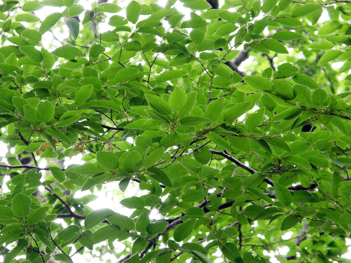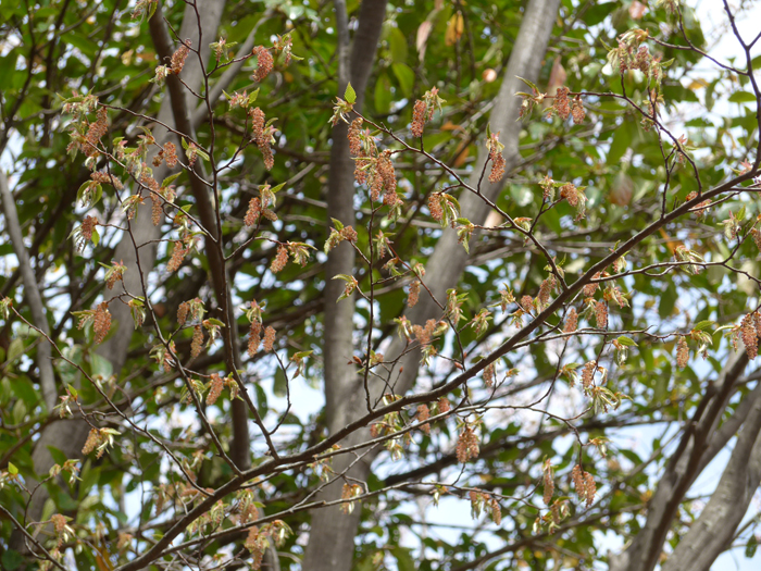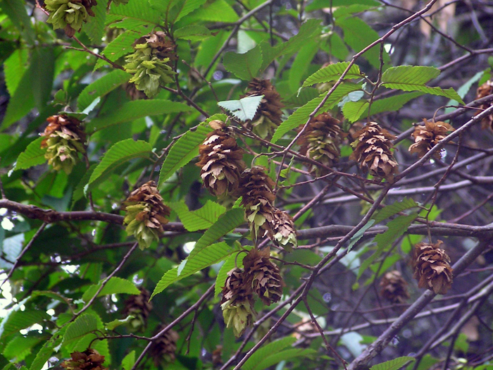 | 形態 | 樹皮は灰褐色で、縦に網目模様ができる。若木では平滑だが、やがて縦に割れ目が入る。葉は先が尖った長卵形〜披針状長楕円形で、20~24対の著しい側脈があり、重鋸歯があり、互生する。葉表はほぼ無毛で、葉裏には脈上にがある。4月頃、新芽の展開より早く、または同時に花が咲く。雄花序は黄褐色で、前年枝の葉腋から下垂する。雌花序は本年枝の先の新芽の中に出る。花が終わると、大量の雄花序が落下する。根元に堅果がついた葉のような果苞が対生して連なり、花穂となる。果苞は先が尖った長卵形で、粗い鋸歯があり、密にぎっしりつく。果実は10月頃熟す。 |