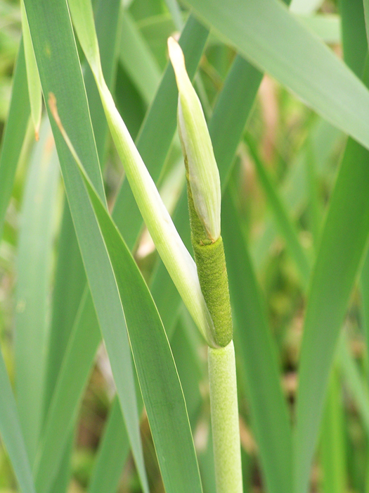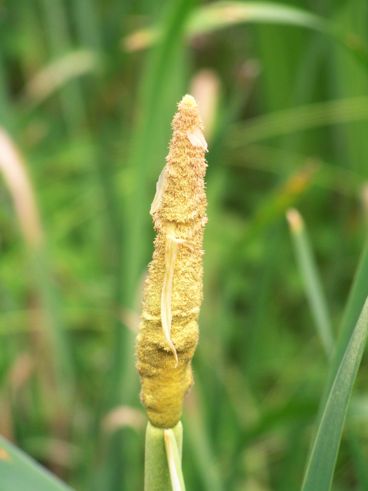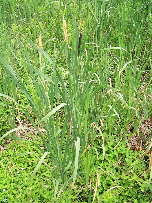 | 形態 | 地下茎が地中を縦横に走り、群落を形成する。葉は、白緑色の剣状。6~7月頃に花茎を立ち上げ、茎頂に肉穂花序を作る。花序は上が雄花序、その下に雌花序ができる。雄花序はベージュ色で、軸には1〜4個の節があり、節には苞葉がつく。雌花序基部にも苞葉がある。苞葉は早くに脱落する。雌花序は薄緑色から次第に茶色になり、ソーセージの串刺しのような姿になる。果穂は冬には崩れて白っぽい綿状になって風で飛ばされる。 |